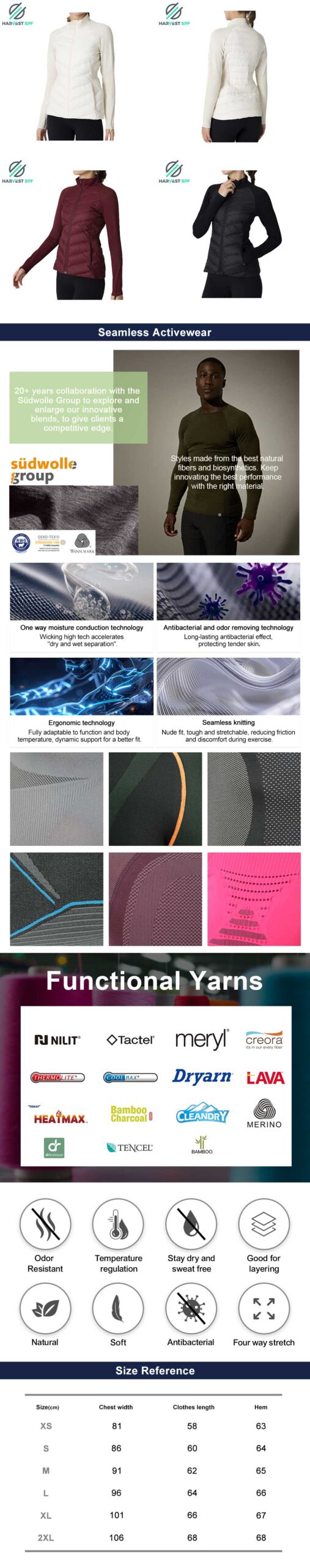 Harvest SPF Textile Co., Ltd is specialised in R&D and manufacturing of functional seamless activewear, basics, and outdoor sportswear like Skiing, Cycling, Hiking.
